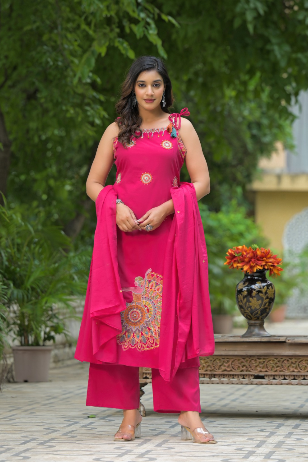 Tharvi stunning and unapologetically vibrant three-piece Indian ethnic ensemble, consisting of a sleeveless kurta (tunic), matching wide-leg palazzo pants, and a coordinating dupatta (scarf/shawl). The entire set is saturated in a brilliant hot pink or rani magenta hue, serving as a powerful, lively background for the large, intricate embroidered motif. The overall aesthetic is one of bold festivity, modern ethnic charm, and comfortable elegance, perfect for celebrations.