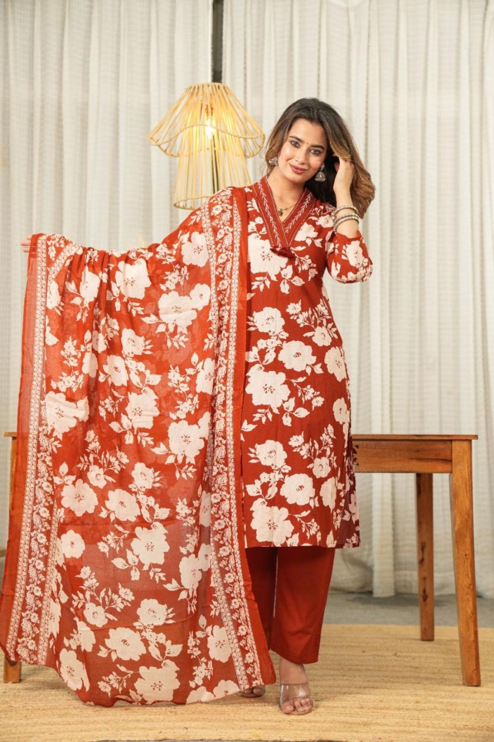 Step into timeless grace and charm with this Rust Floral Printed Cotton Suit Set, designed for women who value both elegance and comfort. Crafted from premium breathable cotton fabric, this outfit combines traditional artistry with modern appeal — perfect for everyday wear, festive gatherings, and casual occasions alike.