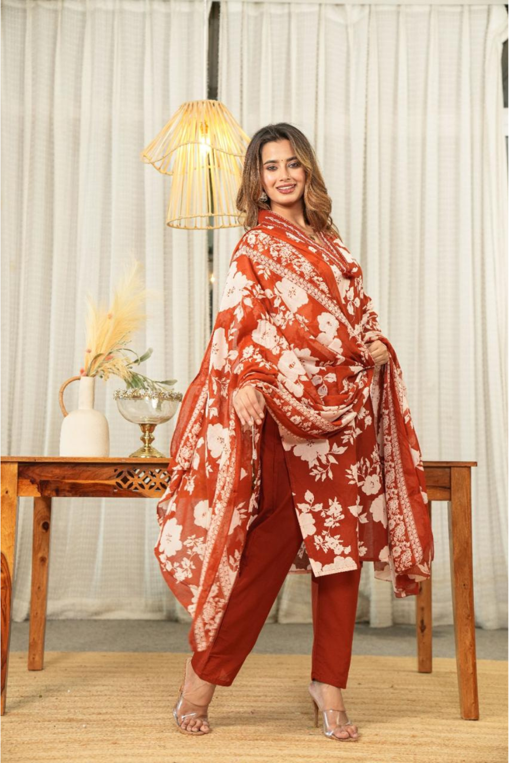 The a line suit is adorned with soft ivory floral motifs that create a soothing contrast against the deep rust base. The large botanical patterns add freshness and vibrancy, reflecting the timeless connection between nature and femininity. -