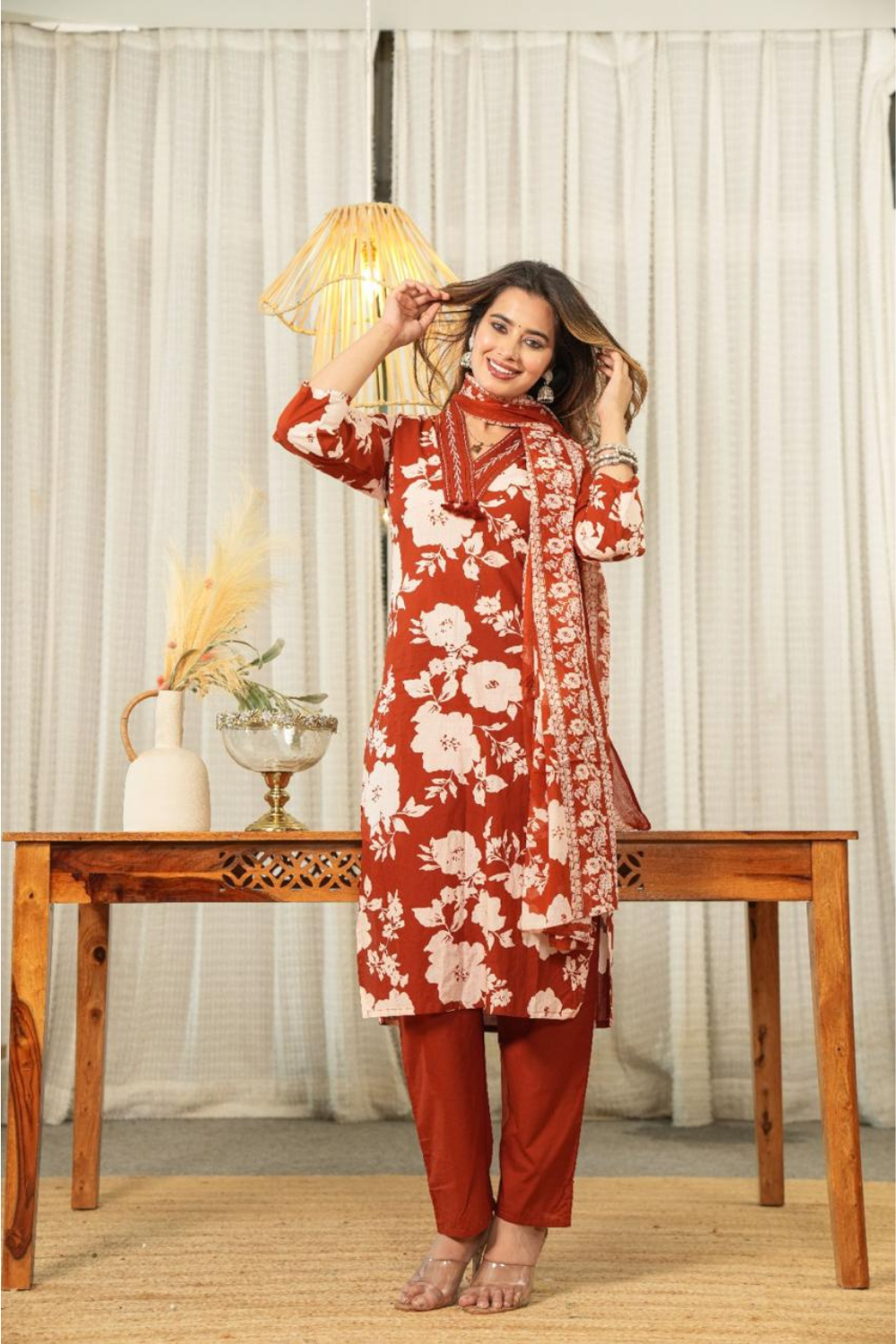 Bottom: Solid rust cotton pants provide a comfortable and tailored fit that complements the kurta perfectly.