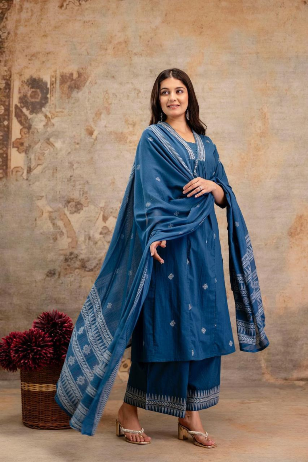 This ensemble acts as a powerful synthesis of age-old techniques and contemporary fashion. The use of geometric and folk motifs in white on indigo is a direct nod to classic Indian textile traditions, particularly Dabu or Ajrakh printing, where patterns are often created using mud resist and deep dyeing processes. By employing these traditional aesthetics on modern silhouettes—the wide palazzo and the streamlined kurta—the garment achieves a relevant, global appeal.
