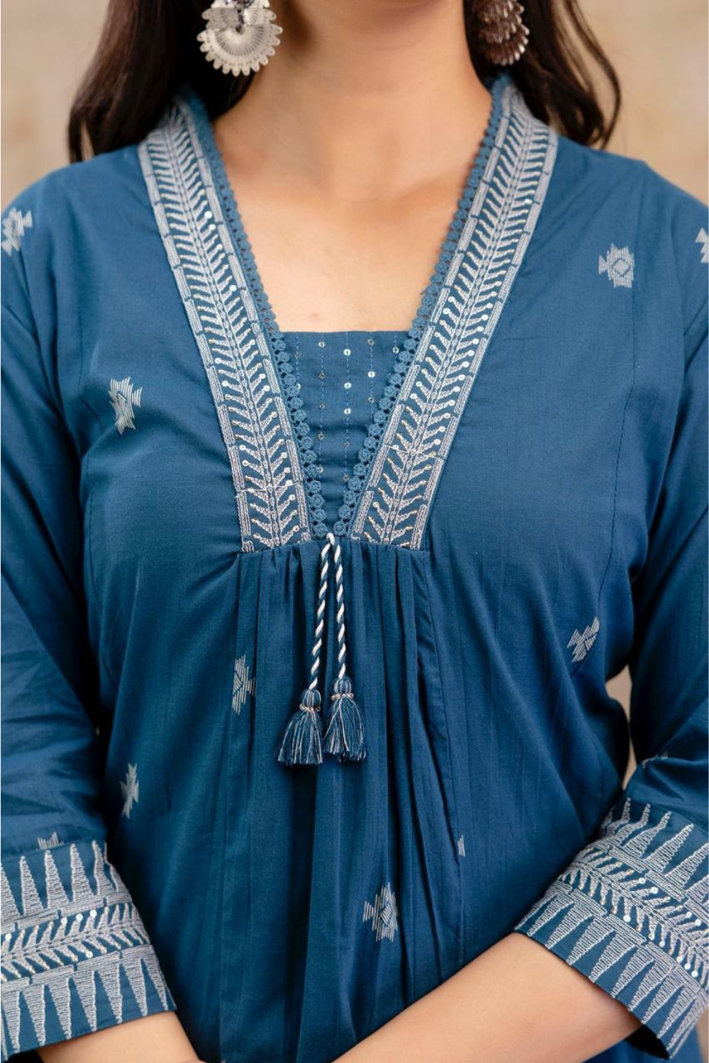 The rich blue color holds cultural significance, often symbolizing tranquility, depth, and heritage. The flow and modesty of the cut respect traditional Indian dressing norms while the wide-leg pants and minimal accessories reflect a confident, modern approach to fashion. The outfit thus serves a dual purpose: it honors the rich legacy of Indian handloom and printing while offering a comfortable, fashionable option for the discerning modern wearer who values sustainability, craftsmanship, and timeless style over transient trends. It represents a mature evolution of ethnic wear, prioritizing fabric integrity and cultural storytelling.