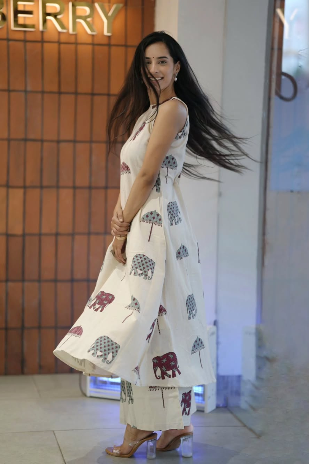 - Print Consistency: The trousers are also printed with the same charming elephant and umbrella motif, ensuring a cohesive, full-body pattern. The print density may be slightly less concentrated than the kurta, or the fabric’s lightweight nature makes it appear softer.