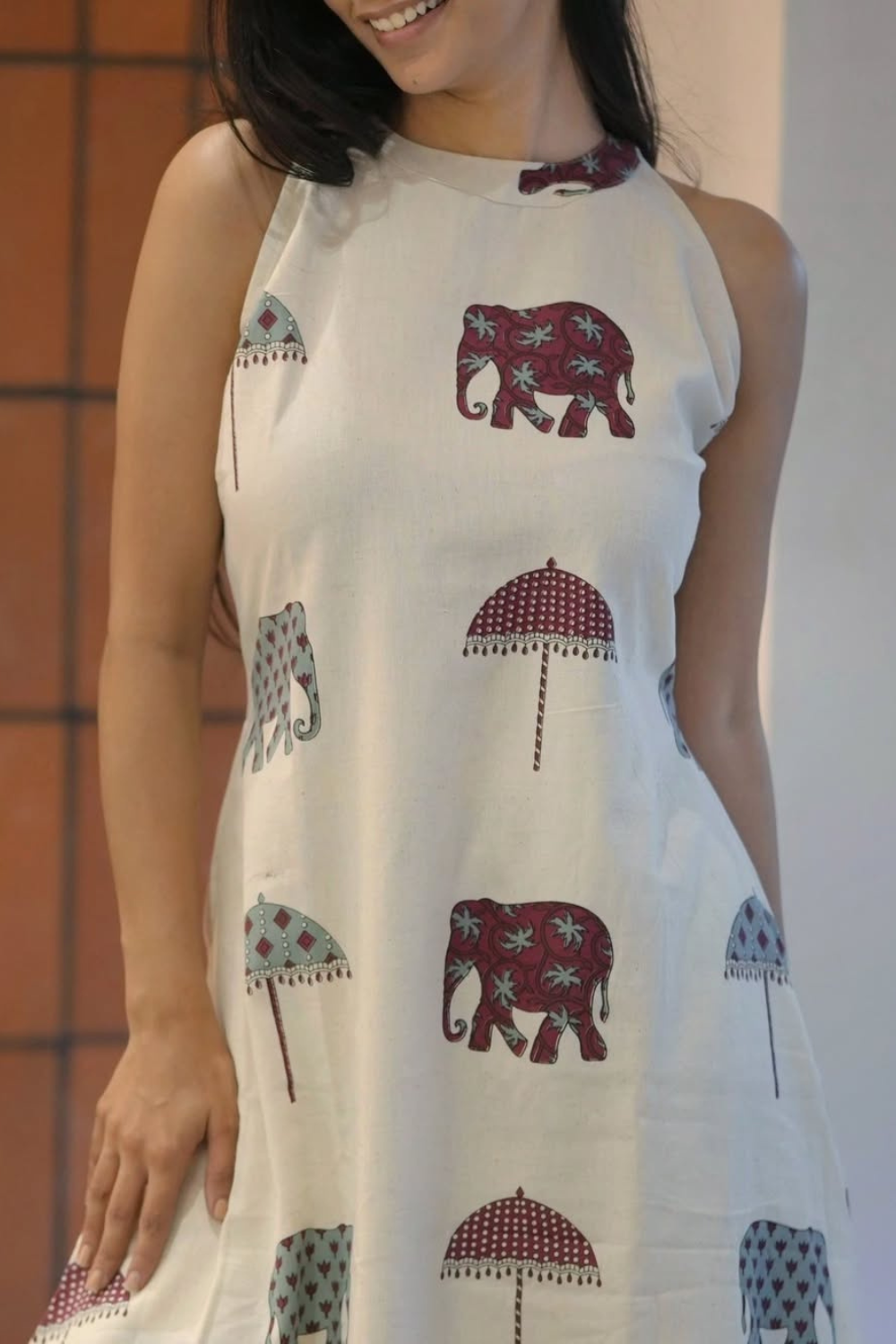 - Playful Sophistication: The whimsical elephant and umbrella print injects a fun, conversational element, while the clean, A-line cut and high neck maintain a sophisticated, tailored feel.
