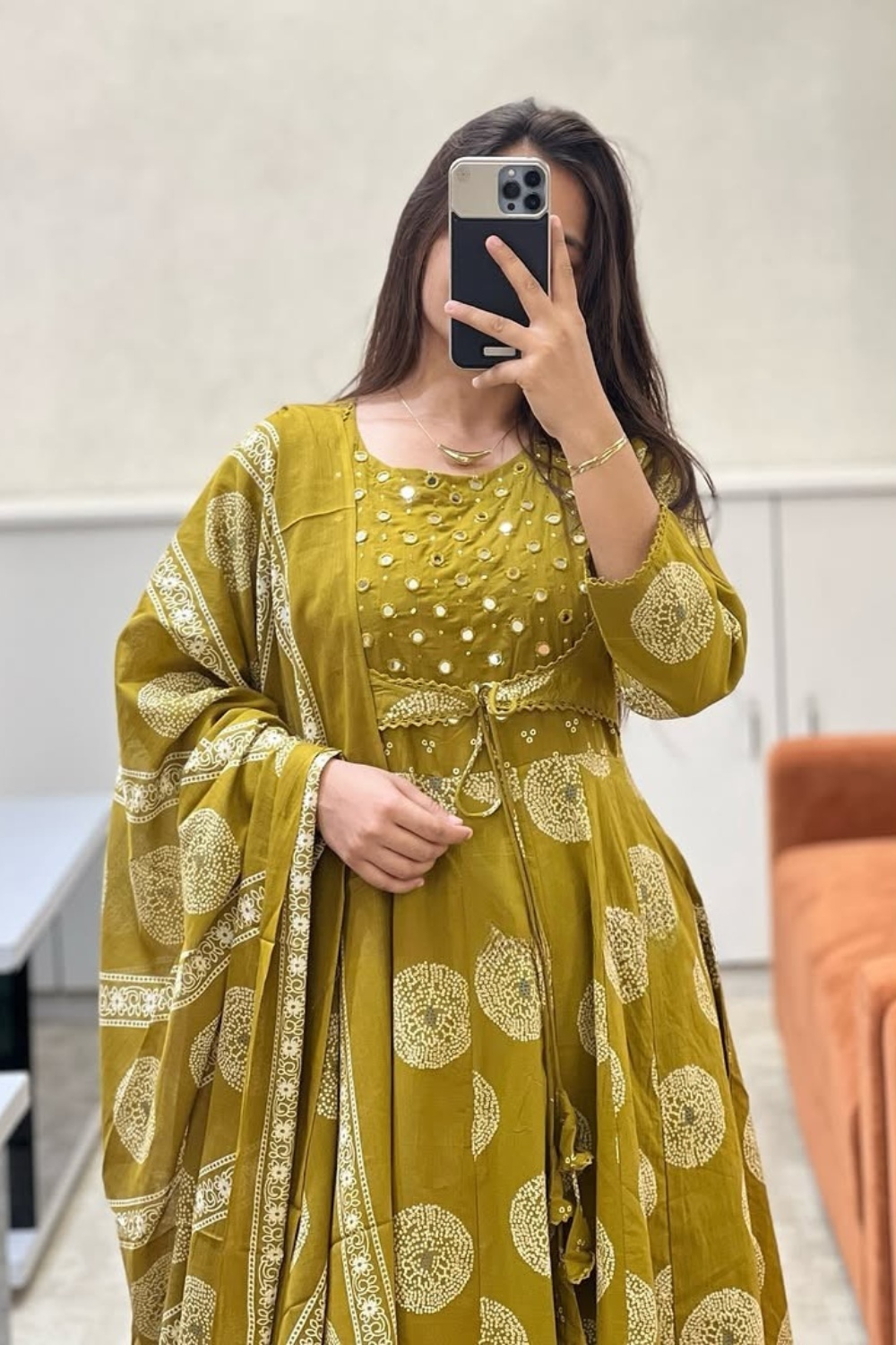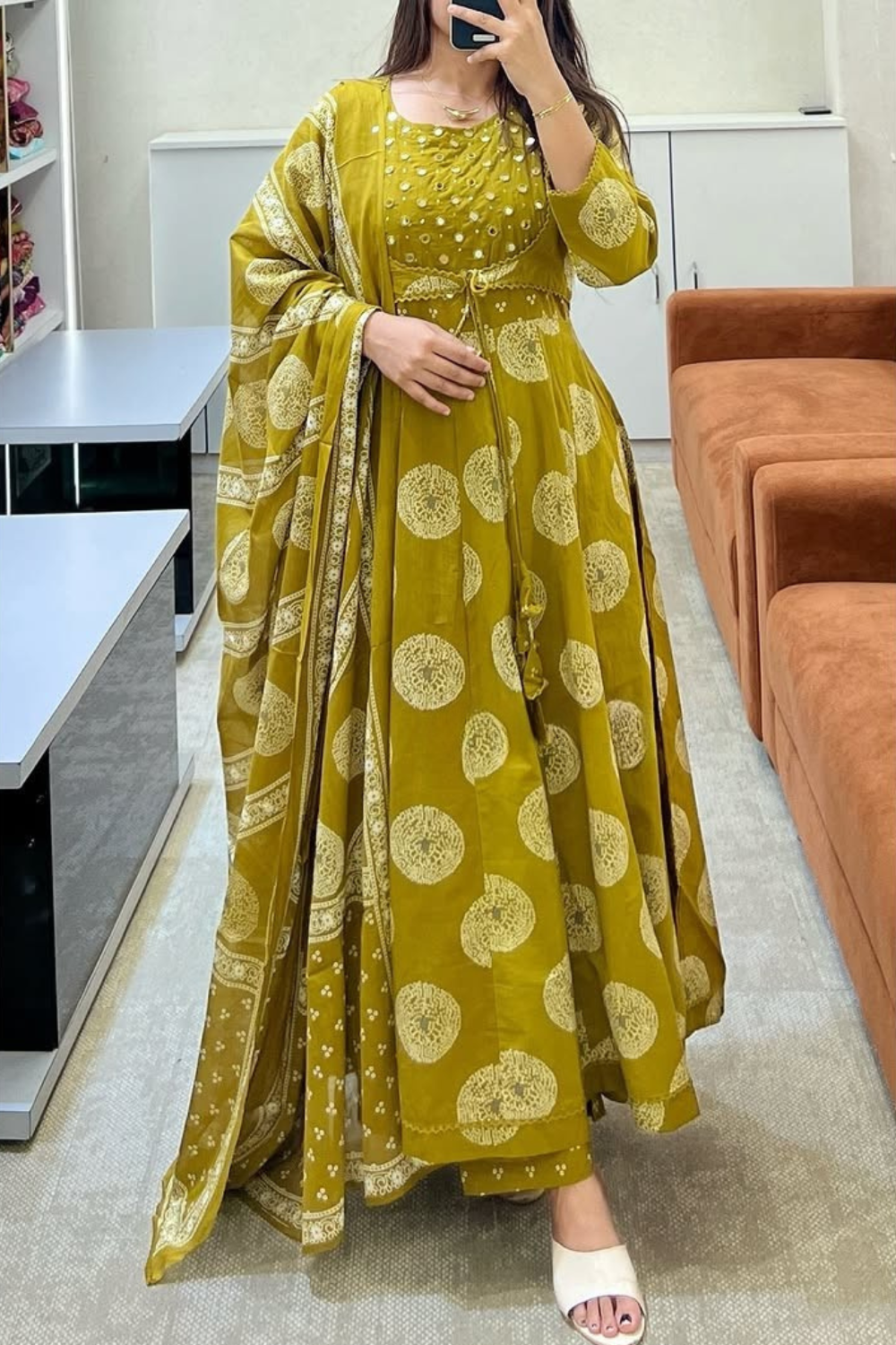 Tharvi beautifully crafted three-piece Indian ethnic ensemble, consisting of a flared Anarkali kurta (tunic), matching trousers, and a coordinating dupatta (scarf/shawl). The outfit is drenched in a warm, inviting shade of mustard yellow or olive-gold, which provides a stunning backdrop for the traditional block printing and festive mirror work. The overall aesthetic is one of traditional luxury, comfortable elegance, and contemporary festive style.