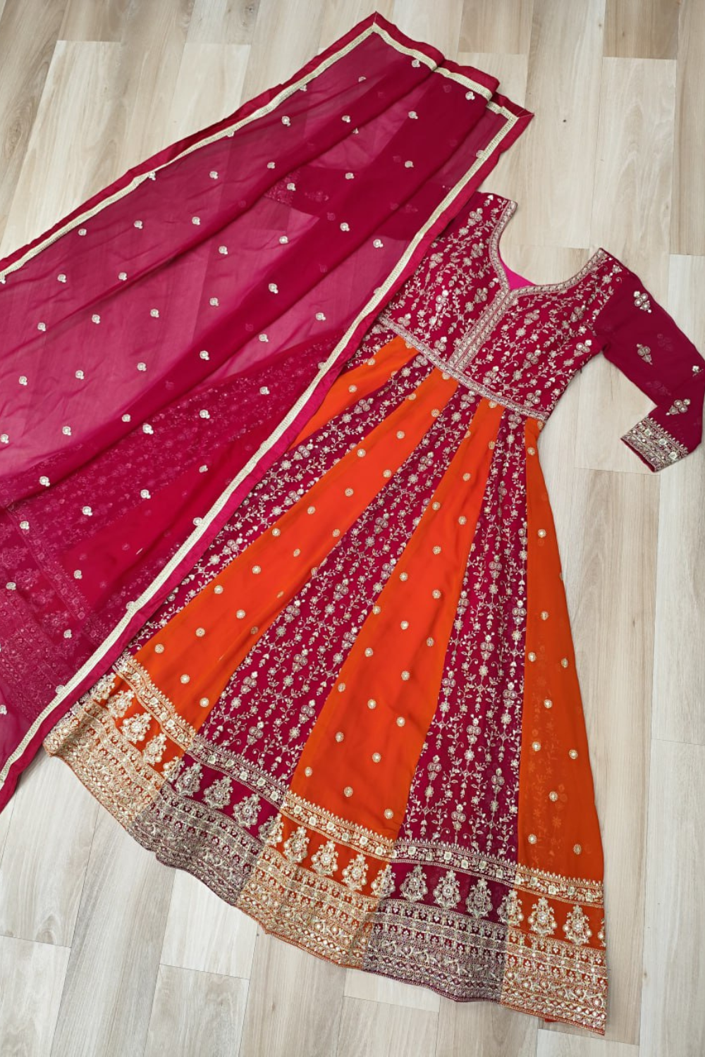 Tharvi three-piece Indian evening ensemble (often referred to as an Anarkali Gown or Lehenga-style Anarkali), designed for grand festive occasions. The outfit is a masterful showcase of bold color blocking—vibrant magenta (rani pink) and fiery saffron orange—adorned with dense, intricate gold embroidery. The set comprises a floor-length gown, matching trousers (implied beneath the volume), and a coordinating dupatta. The overall aesthetic is one of traditional grandeur, modern festivity, and opulent craftsmanship.